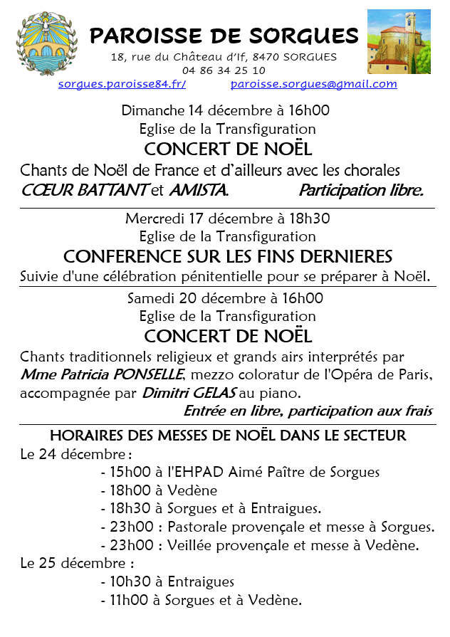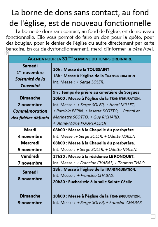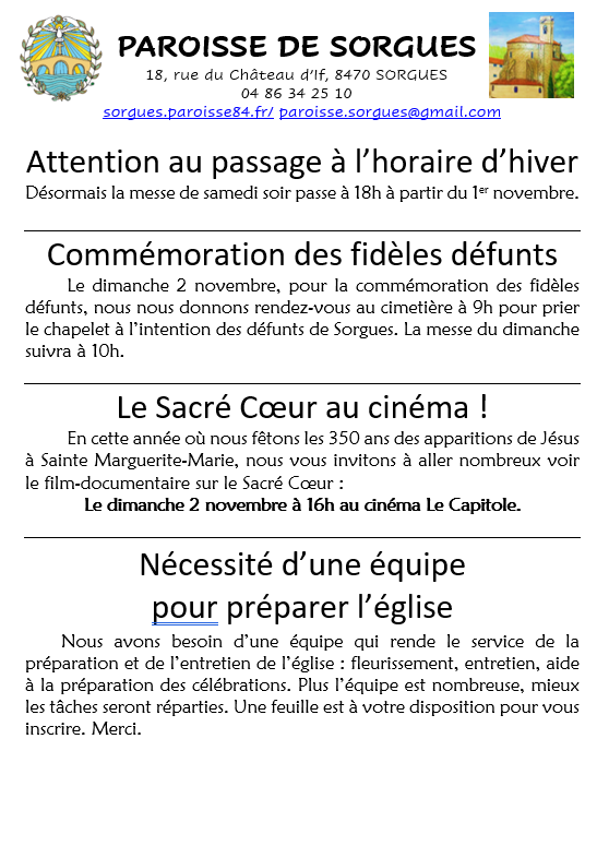 Chaque week-end nous éditons une feuille paroissiale dans laquelle vous trouverez les horaires des messes de Sorgues ainsi que les informations paroissiales les plus importantes.